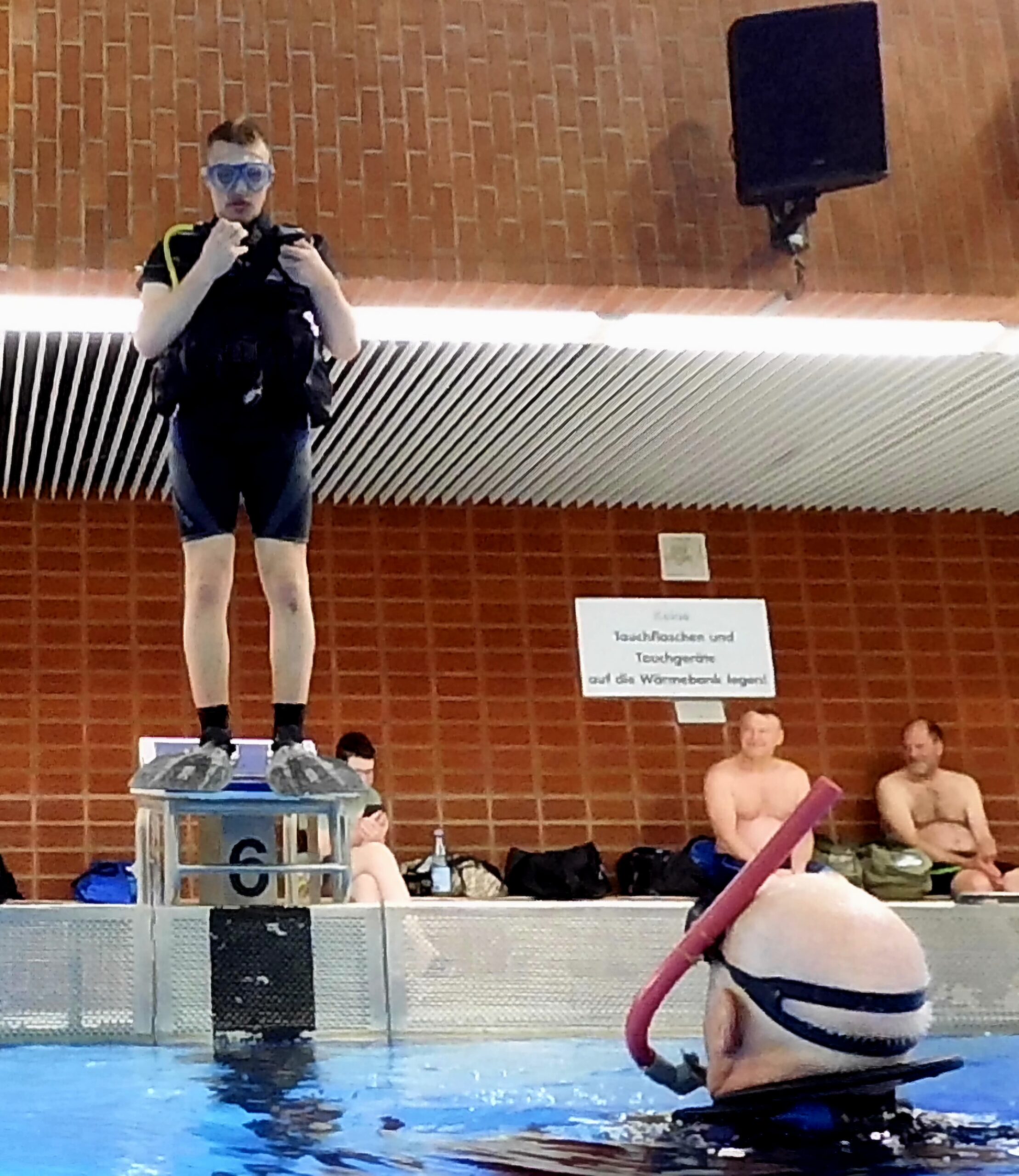 Die Ausbildung zum Grundtauchschein ist in vollem Gange.  Zur Ausbildung gehören auch diverse praktische Übungen. Am Anfang steht der Sprung ins Wasser. Durch den Sprung vom Startblock wird ein Sprung von einem Schiff simuliert. Neben...